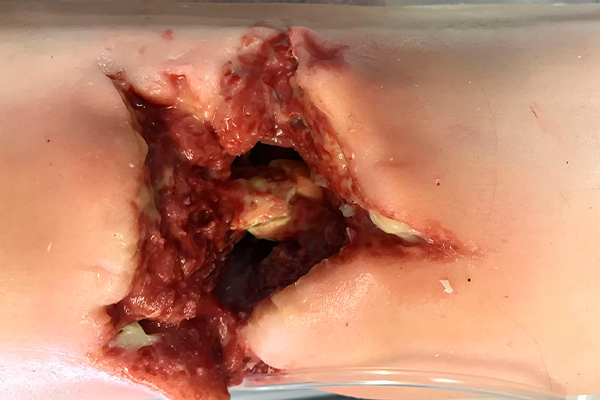 - El tejido de la herida es suave y realista, muestra una fractura abierta para agregar nivel de dificultad.
