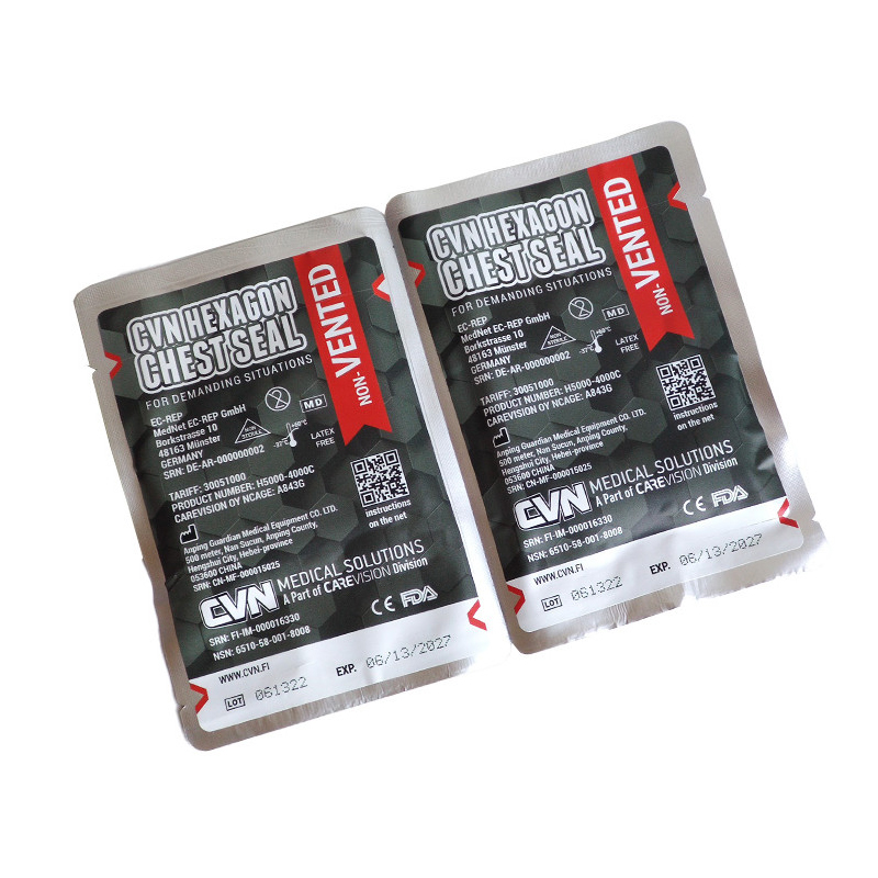 Hexagon Chest Seal es ideal para el tratamiento de heridas abiertas de tórax. El adhesivo de hidrogel de fuerte adherencia le permite adaptarse perfectamente a la superficie de la piel. Gracias a la cubierta de plástico de dos partes, la colocación del Chest Seal es realmente fácil y rápida. Diseñado con forma hexagonal, lo que permite una cobertura amplia. Contiene dos apósito torácicos empaquetados por separado, lo que permite utilizar uno y reserva el otro.