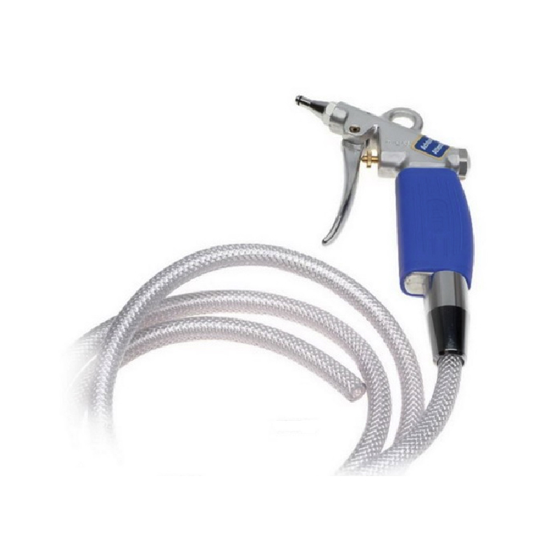 Con la pistola de limpieza Selecta, el chorro de agua o aire se puede dosificar finamente en todo el rango de actuación del grifo mediante un nuevo mecanismo de dosificación. El caudal máximo de agua o aire también se puede ajustar individualmente mediante el pequeño tornillo moleteado situado detrás del grifo. Las orejetas simplemente se conectan al cono de seguridad en la punta de la pistola. Este accesorio es fiable incluso bajo alta presión. La empuñadura de pistola está aislada térmicamente.
